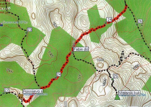 Težina: Lagana staza koja kreće od Škrbine Drage i lagano se uspinje do križanja s Premužićevom stazom. Po Premužićevoj stazi još 5 min do Rossijevog skloništa. Dolazak do početka staze je iz pravca Tromeđe po stazi br. 26 ( od Tromeđe do Škrbine drage 0:20 h po šumskom putu). Staza dijelom vodi kroz šumu, ali izlazi na vrtaču Fabin do i uspinje se njezinim rubom. Cijelim putem predivni pogledi na stijene Vratarskog kuka koji pripada području strogog rezervata prirode Rožanski kukovi.